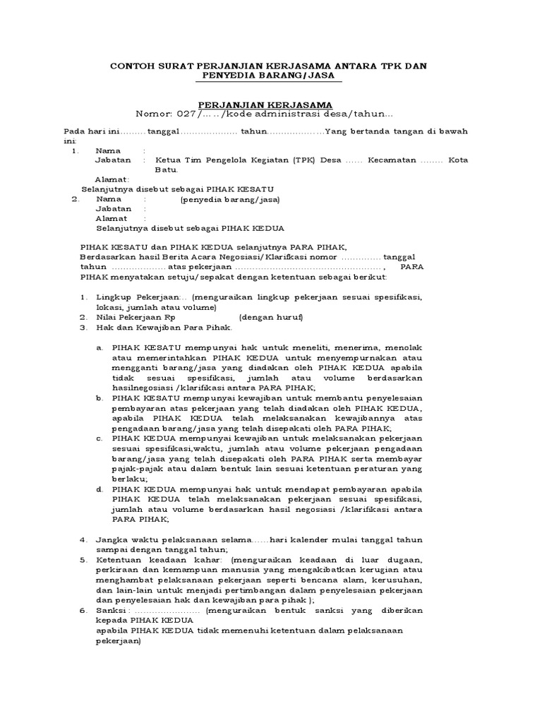 Contoh Surat Perjanjian Kerjasama Antara Tpk Dan Penyedia Barang Pdf